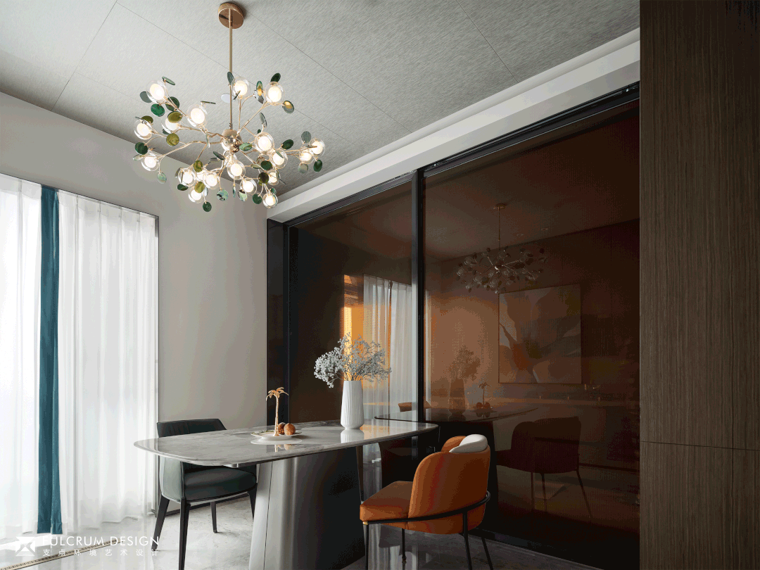 吊燈燦若星辰,被紗簾遮擋住的窗戶,為餐廳輸送浮光躍金、皓月千里,美景、美食,相得益彰。