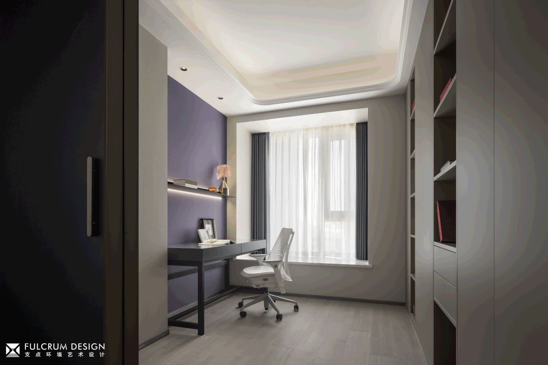 書房在女兒房的對面,玻璃移門既改善過道采光,又讓書房呈現(xiàn)出較為開放的姿態(tài),簡約的造型搭配一面神秘的紫羅色,讓閱讀沉溺在優(yōu)雅、靜謐的時光中。